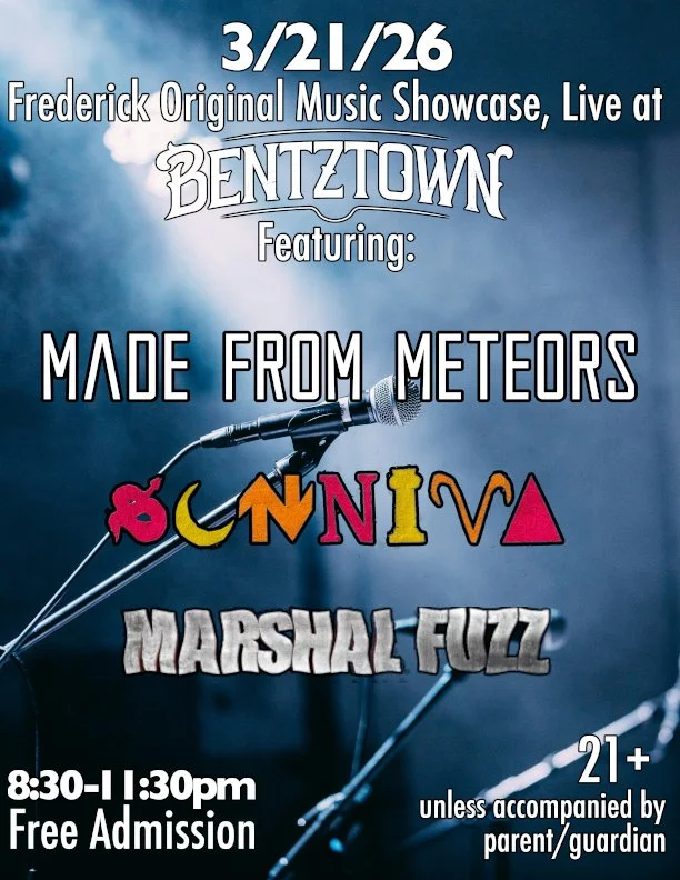 MFM @ Bentztown Saturday, March 21, 2026 8:00 PM 11:30 PM Bentztown 6 South Bentz Street Frederick, MD, 21701 United States (map) Google Calendar ICS Check out some all original Frederick bands, live at Bentztown in the heart of downtown! Made From Meteors will be following other great local acts, Sunniva and Marshal Fuzz. Great food, great vibes, and great music. Don’t miss out!Show Start 8:30pmFREE ADMISSION!